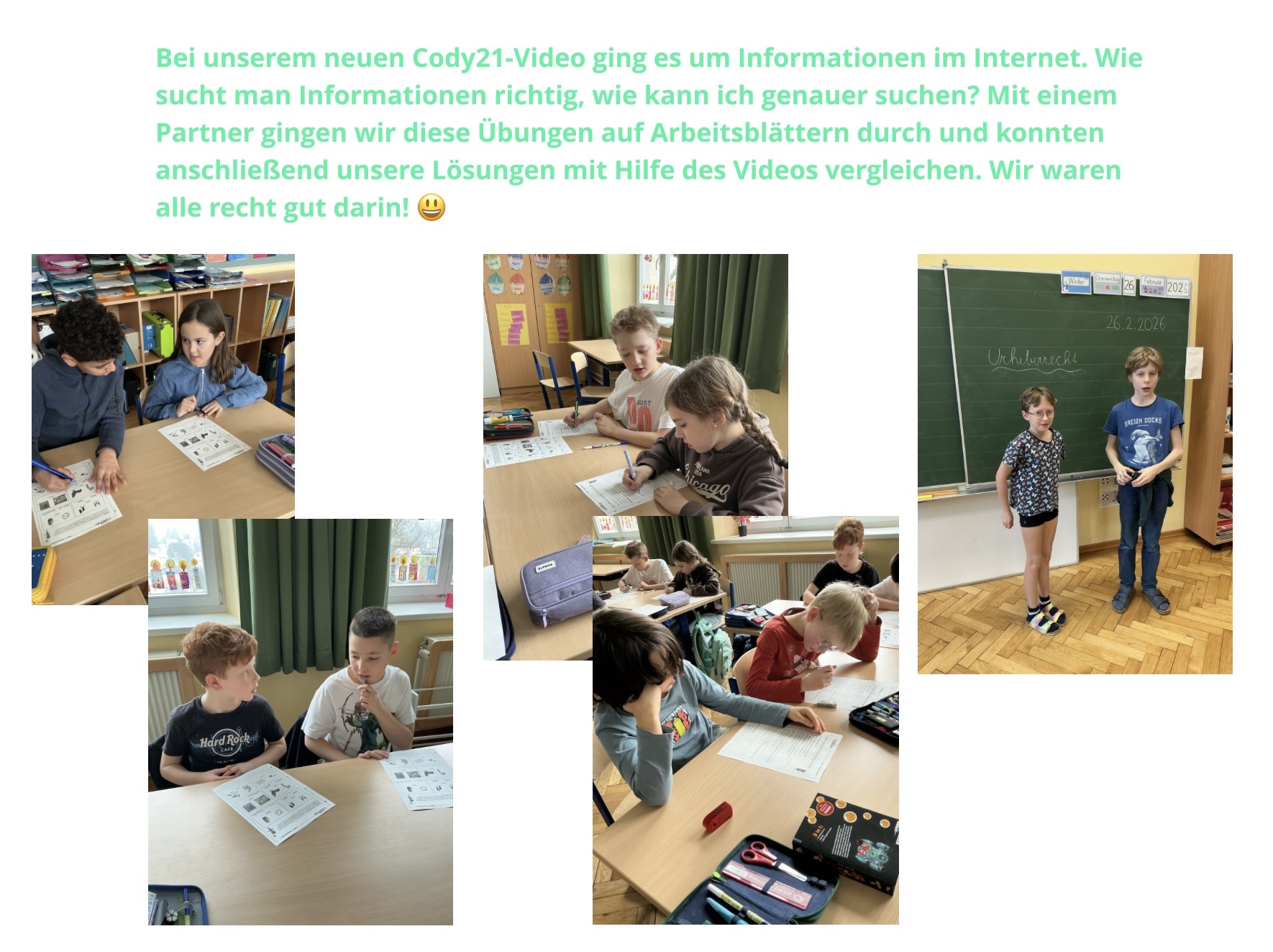 Bei unserem neuen Cody21-Video ging es um Informationen im Internet. Wie sucht man Informationen richtig, wie kann ich genauer suchen? Mit einem Partner gingen wir diese Übungen auf Arbeitsblättern durch und konnten anschließend unsere Lösungen mit Hilfe des Videos vergleichen. Wir waren alle recht gut darin!